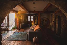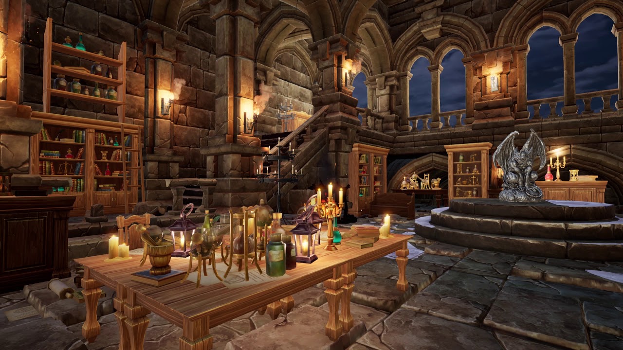 >In a tower overlooking the fields, several mysterious figures look over a bubbling cauldron, a clear section in the middle acting like a window looking into several events elsewhere.