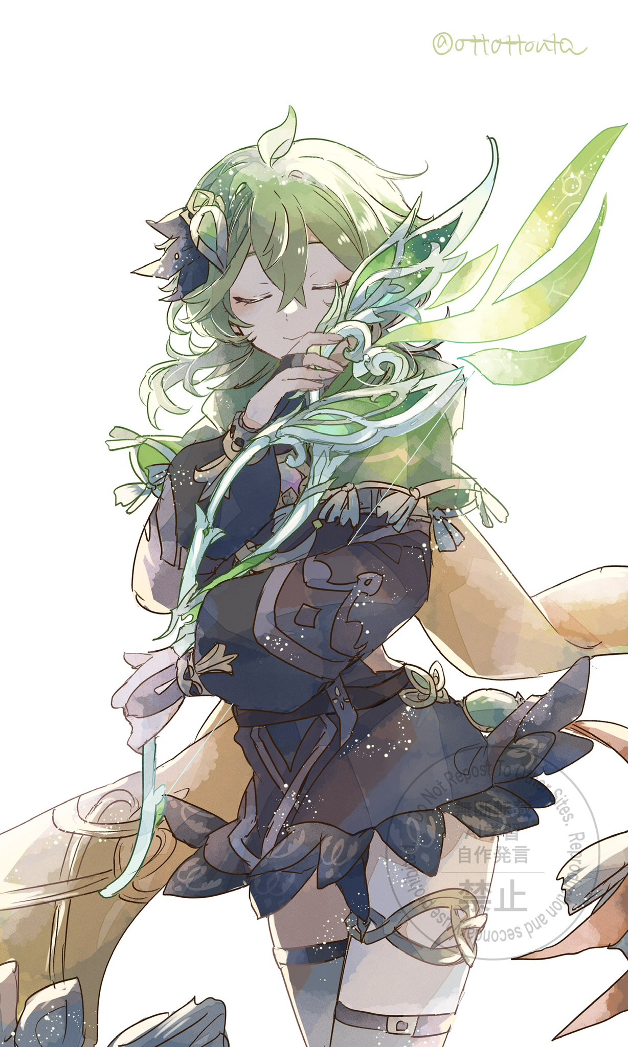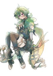 >Within one of the fields, a lone green-haired woman sits among a collection of bright, pastel-coloured flowers, writing down notes as she mutters to herself.