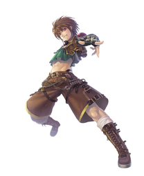 >Running at a much slower pace, the girl carefully avoids the debris from the chickens, her caution being fuelled by the fact that both of her hands are occupied with cradling a decorated tome of some kind. Still, as she reaches the boy she takes his hand, making sure to hold onto the book even more tightly with her free hand.