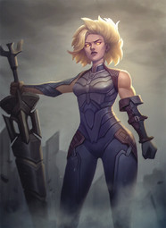 >He lands several meters from Conquest, rattling and cracking the ground from the force. He holds up his beamsword, pointing it towards her."I'll put you down for good this time."